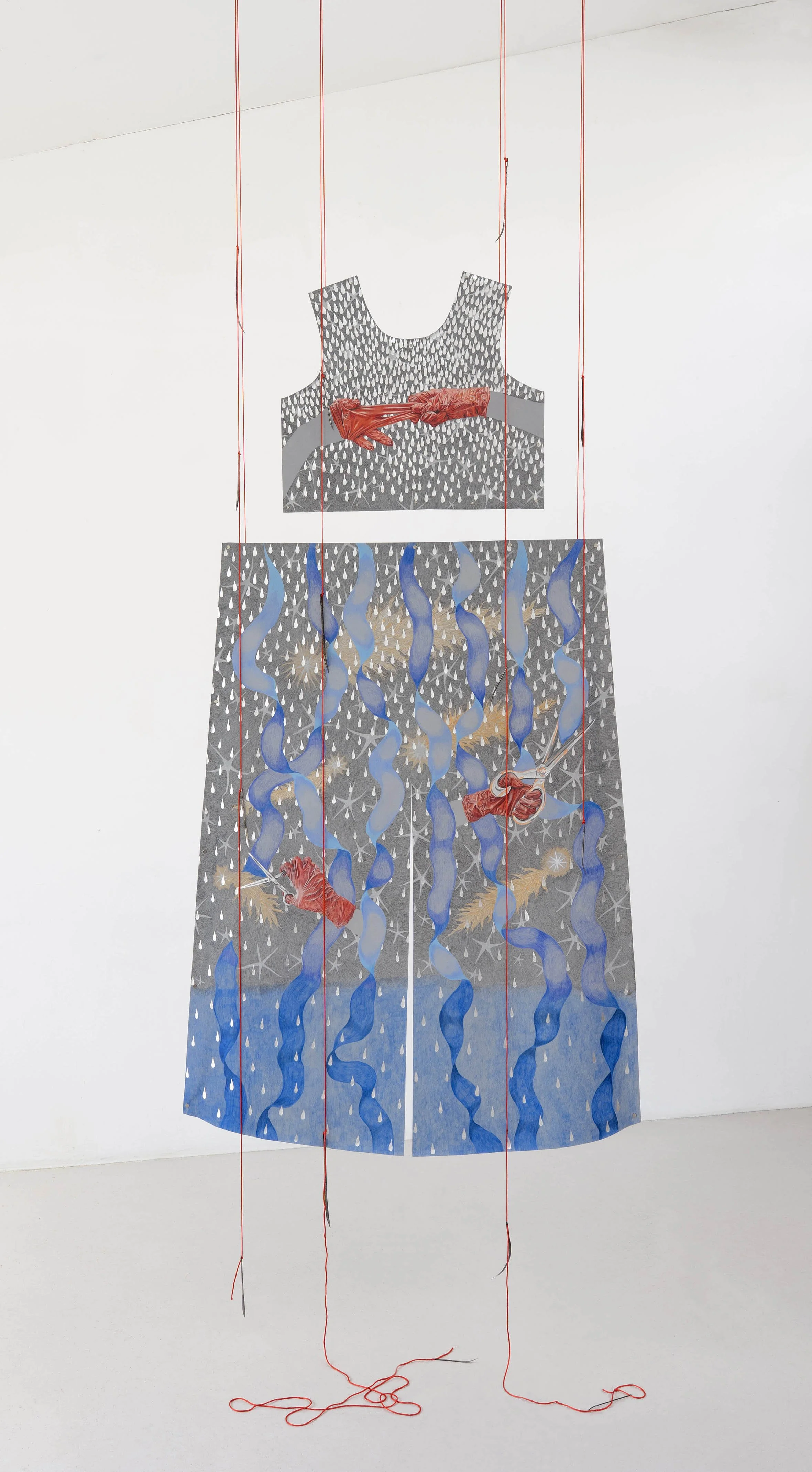 Pencil and aluminium leaf on reflective fabric with leather needles and cord